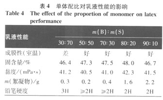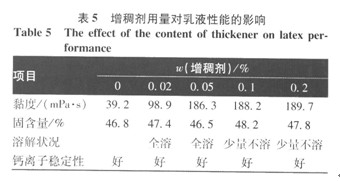 由圖7可見,在相同反應條件下,隨著引發劑用量增加,乳液固含量和黏度明顯提高,表明反應速率隨引發劑用量增加而加。陜,在0.3%~0.4%時,波動較小。由于引發劑用量過少時,形成的自由基過少,無法有效地引發單體聚合,使反應緩慢;而用量過多則會形成過多的自由基,使反應過于劇烈不利于控制[12]。鑒于上述分析,選取引發劑用量為單體質量的0.4%。 2.8 單體配比對乳液性能的影響 按表1配方,控制聚合溫度、時間分別為 由表4可見,隨丁二烯用量增加,體系固含量和黏度波動較小;室溫下膠乳成膜性好;絮凝物含量逐漸增多,最后出現少量凝膠;硬度逐漸降低。主要是因為隨著丁二烯含量增多,體系中軟鏈段含量增多,所以硬度會隨丁二烯含量增加而下降;而隨著軟鏈段增加聚合物鏈易彎曲纏繞,增大交聯度;雙鍵增多也會使聚合物中雙鍵被打開幾率增大,發生支化反應,至絮凝物含量增多。故可依據需要來調節單體配比。鑒于上述分析,實驗選取丁二烯與苯乙烯質量比為70: 30。 2.9增稠劑用量對乳液性能的影響 選擇B/S質量比為70/30,其余反應條件同2.7,考察羧甲基纖維素鈉用量對乳液性能的影響,結果見表5。
