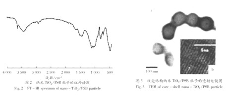 圖2、圖3為按表1配方,控制聚合溫度、時間分別為64℃、3.5 h,納米Ti02為總質量的0.5%,引發劑為單體質量的0.4%,m(B):m(S) =70:30,乳化劑為總質量3.5%時,采用半連續種子乳液聚合法制備的納米Ti02/聚丁苯(PSB)復合乳液乳膠粒子的紅外譜圖(圖2)和透射電鏡圖(圖3)。