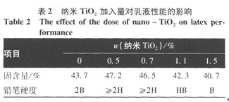 圖2中2865~3000cm-1為脂肪族C-H鍵伸縮振動,1723cm-1為酯鍵的C=0鍵伸縮振動,l 602 cm-1為苯基C-C鍵的伸縮振動,l 535 cm-1為苯環的伸縮振動,1380 cm-1為CH2中C-H鍵平行振動,1280 cm-1為苯環C-H鍵面內彎曲振動,1635 cm-1處附近吸收峰為C-C雙鍵振動。其中500~780 cm-1處為Ti-0鍵的吸收帶。由圖3a可見,粒子呈平均粒徑約150 nm的核殼結構,而圖3b粒子中心存在明顯晶格條紋,由此可見實驗合成了以納米Ti02為核,PSB為殼的核殼結構納米粒子。 2.2 納米Ti02用量對乳液性能的影響 按表1配方,控制聚合時間、溫度分別為4h、