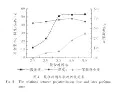 由表2可見,隨納米Ti02用量增加乳液固含量先增加后緩慢下降。可能因為納米Ti02表面過多電荷與體系中自由基反應,減少了活性自由基,使單體轉化率降低,而引起乳液固含量下降。71。膠乳硬度在加入納米Ti02后從2B提高到2H以上,但用量超過總質量0.7%時硬度降低。主要是因為,納米Ti02可以有效地提高膠乳涂膜的力學性能,而過多的納米Ti02難以全部被聚丁苯包裹,致使部分顆粒團聚,降低涂膜的致密性,從而使硬度降低。因此,納米Ti02質量占總質量的0.5%~0.7%為宜。本實驗選用0.5%作后續實驗基準。 2.3聚合時間對乳液性能的影響 按表l配方,控制聚合溫度在