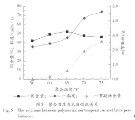 由圖4可見,隨著聚合時間延長,黏度變化很小,由乳液聚合機理知,雖然聚合時間延長使膠乳粒徑增大,但單位體積內膠束數減少,因此黏度變化不大。隨著聚合時間延長,聚合反應程度增大,所以固含量會逐步上升,而凝膠含量有所增加;在聚合過程中,當聚合2h后固含量為12.3%,聚合3h后固含量達到了50.8%,而后變化不大,聚合反應速率前快后慢。主要因為起初單體在體系中分散性較好,濃度較高提高了乳液聚合速率[8]。聚合時間在3h左右,固含量出現拐點,而延長時間增加了絮凝物含量,鑒于上述分析,聚合時間選為3.5 h。 2.4反應溫度對乳液性能的影響 按表1配方,控制聚合時間為3.5 h,納米Ti02用量為總質量的0.5%,考察聚合溫度對乳液性能的影響,結果見圖5。