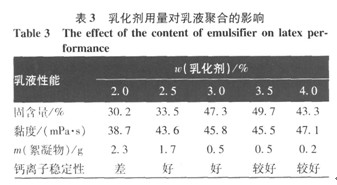 由圖5可見,在相同聚合時間內,聚合溫度升高膠乳黏度明顯增大,固含量先隨溫度升高而增大,后隨凝膠量增加而有所下降。提高聚合溫度雖然可以加快反應速率,但隨溫度升高,反應會變得越來越劇烈,將不利于控制,如反應溫度在 2.5乳化劑用量對乳液聚合的影響 采用m(SDS):m(OP-10) =1:1復配,按表1配方,控制聚合溫度、時間分別為
