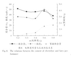 由表3可見,隨著乳化劑用量增加,體系固含量明顯提高,絮凝物含量降低,鈣離子穩定性明顯提高,黏度有所提高。這是因為適量乳化劑可以使乳液保持較高穩定性;但用量過少時,乳化劑僅能覆蓋部分乳膠粒,增大了乳膠粒間碰撞幾率,從而引起團聚,易破乳等;而用量過多會形成大量乳膠束,加快反應速率,提高轉化率,但會使乳膠粒徑變小,不利于高固含量乳液形成[10]。鑒于上述分析,本實驗選取乳化劑用量為總乳液質量的3.5%。 2.6電解質用量對乳液性能的影響 按表1配方,控制聚合溫度、時間分別為