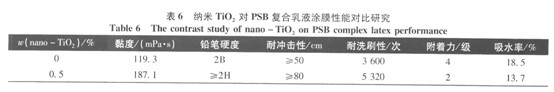 由表5可見,加入少量的羧甲基纖維素鈉可以使黏度明顯升高,而乳液固含量和穩定性基本不受影響,說明加入羧甲基纖維素鈉并不會對聚合物分子結構產生影響,由于增稠劑的增黏效果與用量有關,所以可依據不同的使用要求進行調配。 2.10納米Ti02對PSB復合乳液涂膜性能影響 依據上述分析,可得本實驗適宜聚合工藝條件:納米Ti02、乳化劑用量分別為總質量的0.5%和3.5%,引發劑用量為單體質量的0.4%,聚合溫度和時間分別為64℃和3.5 h.丁二烯/苯乙烯質量比為70/30,K3P04用量為總質量的0.4%。按適宜聚合工藝條件,選擇一組含納米Ti02,另一組不含納米Ti02,其他聚合條件相同,分別合成2組PSB乳液進行涂膜性能對比研究,結果見表6。