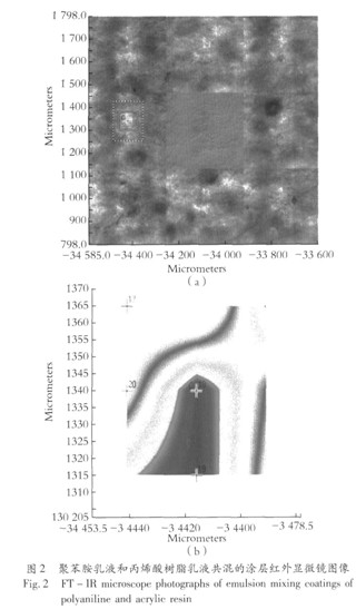 其中圖l(a)是涂膜上選擇一小區域的可見光照片,圖1(b)是圖l(a)圖中選擇的一個小區域的紅外吸收圖。從圖1中可以看出,涂膜表面比較平整,聚苯胺在丙烯酸樹脂中的分布也比較均勻,但是仍有少量白色的小顆粒,初步推測為助乳化劑十六醇的顆粒。 圖2是聚苯胺乳液和丙烯酸樹脂乳液2種乳液共混后的 紅外顯微鏡照片。