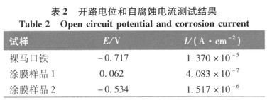 2.2 涂層防腐蝕性能分析 表2是馬口鐵表面聚苯胺/丙烯酸樹脂混合乳液涂層和裸馬口鐵在w( NaCl)=3.5%的NaCl溶液中的開路電位及腐蝕電流測試結果。其中樣品1為乳液互穿網絡聚合法制備的聚苯胺/丙烯酸樹脂防腐蝕乳液涂膜;樣品2為聚苯胺乳液和丙烯酸樹脂乳液共混制備的涂膜。