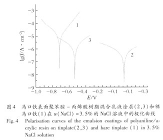 從表2中數據比較可知,乳液互穿聚合物網絡法制備的聚苯胺一丙烯酸樹脂防腐蝕乳液涂膜開路電位比裸馬口鐵高0.779 V,乳液共混法涂膜開路電位比裸馬口鐵高0.183 V。乳液互穿聚合物網絡法制備的聚苯胺一丙烯酸樹脂防腐蝕乳液涂膜腐蝕電流比裸馬口鐵低2個數量級,乳液共混法涂膜腐蝕電流比裸馬口鐵低1個數量級,由此可見,采用乳液互穿聚合物網絡法制備的聚苯胺一丙烯酸樹脂防腐蝕乳液涂膜防腐蝕性能更好。 圖4為馬口鐵表面聚苯胺一丙烯酸樹脂乳液涂層和裸馬口鐵在w( NaCl)=3.5%的NaCI溶液中的極化曲線。 圖4中曲線1為裸馬口鐵片的極化曲線,腐蝕電位為-0.717 V。曲線2是采用互穿聚合物網絡法制備的聚苯胺一丙烯酸樹脂乳液涂膜后的極化曲線,其腐蝕電位為0.062 V。曲線3是乳液共混法涂膜的極化曲線測試結果,其腐蝕電位為-0.53 V,比采用互穿聚合物網絡法制備的乳液涂層的極化電壓要低得多,可見其防腐蝕性能要差一些。這主要是因為兩種方法制得的乳液中聚苯胺的分散性不同,互穿聚合物網絡法制備的聚苯胺一丙烯酸樹脂乳液涂層中聚苯胺的分散性好于乳液共混法。