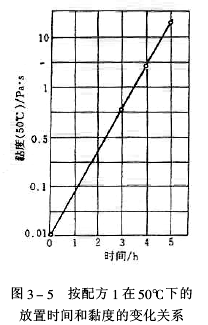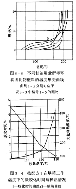 按上述配方在60℃時液體黏度為0.1Pa·s,像清水一樣,其25℃下適用期為1年以上,固化時先在80℃凝膠化,然后分別在120℃、160℃、200℃固化6h,然后再在260℃老化25h,即得耐熱性在300℃以上的塑料,由于使用黏度低,可廣泛地用于澆鑄,做成各種形狀的鑄件。用于浸漬,很容易用于手糊的濕法成型層壓制件上,亦可用于粘合。因其在高溫下有特好的電性能,故廣泛地應(yīng)用于高級電機工業(yè)上和軍工的特需部門,是一種耐熱性極好、強度極高的塑料。 按配方1其凝膠化溫度與凝膠化時間及釋熱情況關(guān)系如圖3-4,由此認為膠化溫度應(yīng)控制在100℃以下為宜。然后再逐步升溫固化。按配方1在50℃下的放置時間約4天,見圖3-5。