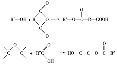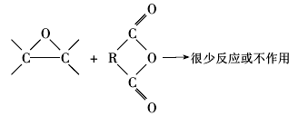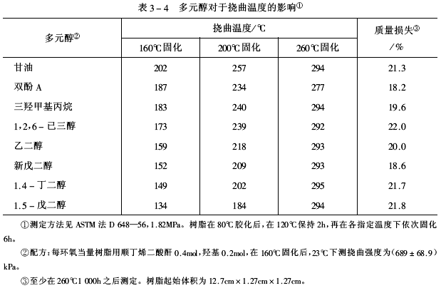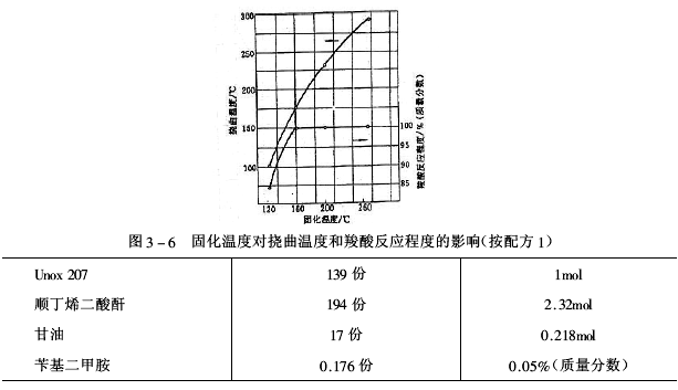 如果酸酐用量比例越高,則熔點越低,在不高的溫度下(40℃)即可成為液體,此液體的使用期能保持1個星期以上。 如改用其他各種多元醇,對于撓曲溫度和質(zhì)量損失的影響如表3-4所示。 對于不飽和酸酐,如順丁烯二酸酐其固化機理是極復(fù)雜的,從圖3-6來看,160℃固化4h幾乎羧酸完全反應(yīng)了,然而耐熱溫度只在高溫固化后才能提高,可能反應(yīng)還需按如下反應(yīng)進行