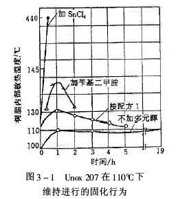如圖3-1所示,35g Unox 207(包括0.4mol酸酐/環(huán)氧當量)混合物,在不加催化劑下于熱空氣(維持110℃)中循環(huán),這個反應(yīng)非常慢,在19h內(nèi)不能凝膠化,但加了三甲羥基丙烷(見配方1)則大量釋熱(可用示差熱分析法測定)5h便凝膠化了,如果添加少量的芐基二甲胺或氯化物則反應(yīng)速度更快,加入多元醇可起到催化和增加交聯(lián)密度的作用。