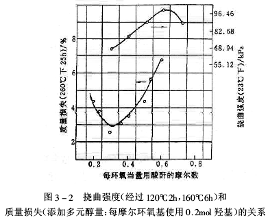 把由Unox 207和順丁烯二酸酐及添加一定量的引發(fā)劑三甲羥基丙烷C2H5C(CH2OH)3組成的熱固性樹脂加熱到50℃即為一個流動狀的流體,在80℃凝膠化,再在120℃、160℃及200℃分別交聯(lián)6h,然后再在260℃循環(huán)空氣下老化25h,得到圖3-2的結(jié)果,表明每環(huán)氧當量用0.3~0.5mol酸酐得到的樹脂性能最好。但若環(huán)氧基的開環(huán)完全依靠與酸酐作用而生成酯鍵,則理論上每個環(huán)氧基需要消耗1mol酸酐,而二氧化雙環(huán)戊二烯應(yīng)消耗2mol酸酐,但從圖3-2結(jié)果看,僅其半量即可獲得優(yōu)良性能的塑料,這說明環(huán)氧基的開環(huán)除了與酸酐形成酯鍵外,形成醚鍵的開環(huán)也起著重要的作用: