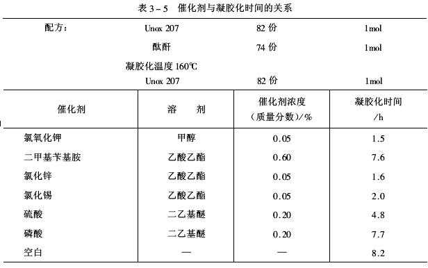 KOH質(zhì)量分數(shù)為0.04%(乙醇為溶劑)120℃時得一均勻熔體,在160℃固化11h,前5h形成凝膠化,得到不熔樹脂其熱扭變溫度為196℃,布氏硬度46。 其固化催化劑除芐基二甲胺、四氯化錫外,還有二乙基鋅一醇系化合物[m(二乙基鋅):m(醇)=1.0~2.0為宜,且用一級醇為好]。 固化催化劑還可應(yīng)用無機酸和堿,各類催化劑與凝膠化時間的關(guān)系如表3-5。