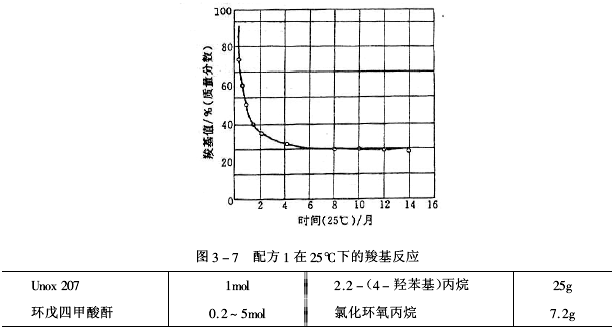 其中以氫氧化鉀、氯化鋅、氯化錫催化作用最強,如果有多元醇存在則作用更猛烈,可大大加速固化的完成。 (2)B階段樹脂生產(chǎn) B階段樹脂是部分固化易熔的樹脂,有多方面的重要用途,做成B階段樹脂溶液,特別適用于干法成型的層壓制件,也可作涂料,黏合劑,固體粉碎后作粉末涂料、壓塑粉,且塑化前具很長的使用期。 按配方1在25℃下保存,圖3-7指出1~2個月后其羧基含量降到原來35%~40%,而1年后降到23%,這樹脂就是B階段樹脂,加熱易熔,一般因生產(chǎn)B階段樹脂時放熱很大,必須在惰性溶劑中反應(yīng)。