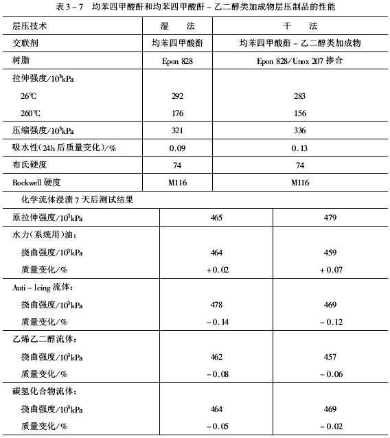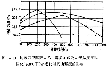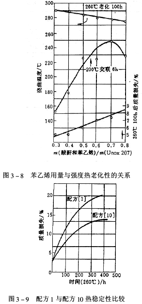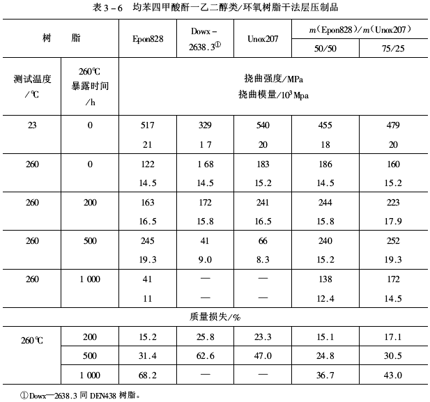 先將前三物在80℃熔解均勻,然后冷至35℃加入苯乙烯和過氧化苯甲酰,先在50℃下凝膠化40min,然后即可升溫至140℃固化。 酸酐和苯乙烯摩爾用量一樣,對于每環(huán)氧當量樹脂來說用0.4mol為宜,見圖3-8。 配方1與配方10(加苯乙烯)其熱穩(wěn)定性比較見圖3-9。 由此可知加了苯乙烯單體后,Unox 207熱穩(wěn)定性得到了顯著的改進。配方2與雙酚A環(huán)氧樹脂混用:按配方8所得到的層壓制品其在樹脂23℃,260℃下?lián)锨鷱姸群湍A慷家劝赐瑯优浞降碾p酚A環(huán)氧樹脂Epon 828高得多,但其缺點是260℃,500h后層壓制品強度上有顯著降低,但若按配方8 Unox 207與雙酚A環(huán)氧樹脂摻用,如Epon828/Unox 207用量為50/50,75/25 時大大彌補了Unox 207的缺點,在260℃使用1000h后層壓制品撓曲強度仍有137.8MPa,熱穩(wěn)定性大為提高(質(zhì)量損失減少見表3-6,圖3-10)且不少性能方面超過了雙酚A環(huán)氧樹脂。加成物層壓制品性能見表3-7。
