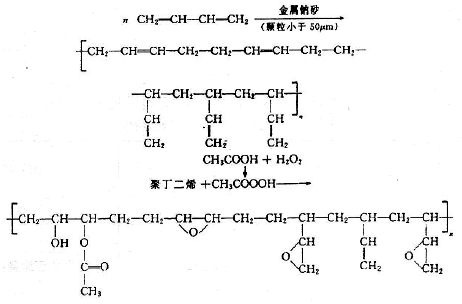 一、合成 丁二烯以金屬鈉砂為催化劑在無水苯溶劑中進行聚合,可以制得低分子量液體聚丁二烯,如果要制得分子量更低的聚丁二烯,可在苯溶劑中加入一定量的甲苯調節劑。液體聚丁烯中含有不少不飽和雙鍵,通過過氧化乙酸氧化反應后就能制成環氧化聚丁二烯,其反應式如下: