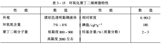 環氧化聚丁二烯中有羥基、羰基和雙鍵存在,雙鍵是原料聚丁二烯殘余,羥基和羰基皆是環氧化反應中副反應產生的,因此選擇有利于環氧化物生成的工藝條件和減少開環反應的趨向是很重要的。當然低溫下進行氧化反應和加入有抑制開環作用的溶劑是有一定效果的。但是比較有效的方法還是以磺酸型陽離子交換樹脂作催化劑的“原地”氧化法比較有效。因為它本身能部分吸收反應中和原料中的水分,使開環反應程度減少,而且和環氧化產物容易分離。因此生產聚丁二烯環氧化物大多采用這個方法。 產品特性如表3-15所示。國外這類產品名稱為Oxirons 2000。因此我國有62000環氧樹脂之稱。