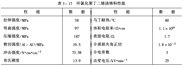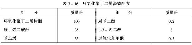 澆鑄料組成物配制方法:將對苯二酚加入到丙二醇中攪拌至互溶后再加入環氧化聚丁二烯,然后攪拌下加熱到70℃,再加入苯乙烯、順丁烯二酸酐、過氧化苯甲酰,在50℃下攪拌至互溶。用真空脫盡組成物中的氣泡后進行澆鑄。按以下固化條件進行處理:80℃/2h+120℃/2h+150℃/12h。固化產物性能見表3-17。