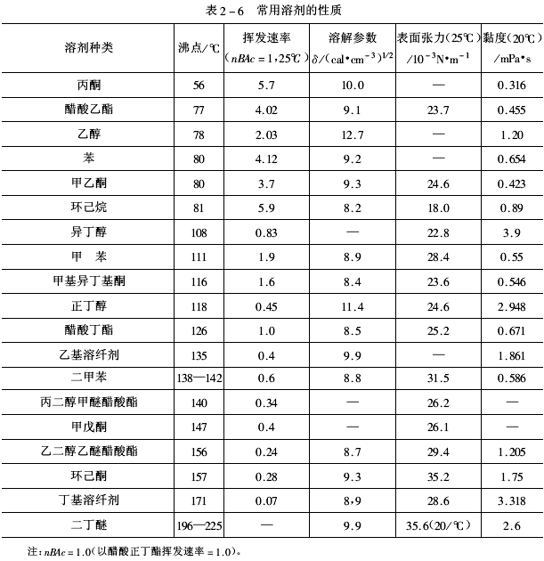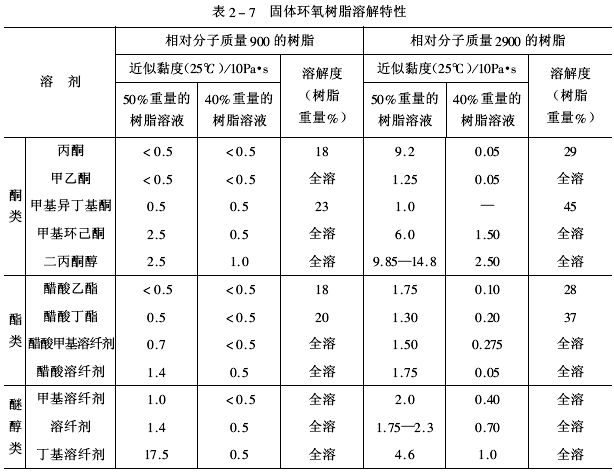 二、溶劑 溶劑與非活性稀釋劑的主要區別是,溶劑主要起溶解樹脂體系的作用,當然也能調節膠液的黏度;而非活性稀釋劑主要的作用是調節涂料的粘度,它可能對樹脂體系有溶解性也可能沒有溶解性。 溶劑的加入,使膠粘劑更便于施工,并可在室溫下進行固化,使膠液黏度低,易浸潤被粘物表面、工藝性好等。但溶劑加入也造成膠粘劑在固化時體積收縮率大,溶劑有時會使被粘物表面溶脹,造成粘結不牢,以及大部分溶劑揮發并易然,有一定毒性等不足。因此在配置膠粘劑時應注意選擇使用。 膠粘劑溶劑的選用,首先考慮其對主體樹脂的溶解性能,其次考慮其揮發速度,因為只有合適的揮發速度才能配出性能良好的膠粘劑和涂料來。再其次要考慮溶劑的黏度、閃點及易燃性。為安全考慮,應盡可能采用較高閃點的醇、醚醇和酯類,用丙二醇醚類代替二醇醚以降低毒性,最后還要考慮氣味、毒性、來源難易及價格高低等。 環氧樹脂可溶解在某些有機溶劑中,樹脂的溶解性隨分子量的增加而降低。酮類、酯類、醚醇類和氯代烴類是環氧樹脂的溶劑,對環氧樹脂有很好的溶解能力。芳烴和醇類不是環氧樹脂的溶劑,但是芳烴和醇混合后,則可作為中等分子量樹脂的溶劑。 環氧樹脂涂料多采用混合溶劑,是由溶劑和稀釋劑組成的,可以降低成本,改善漆膜性能和施工性能,提高溶劑的溶解力。刷涂施工的產品應使用部分高沸點溶劑,如乙基溶纖劑等。表2-6和表2-7列出了常用溶劑的性質及固體環氧樹脂在一些溶劑中的溶解特性供參考選用。