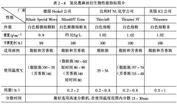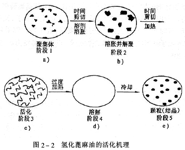 最常用的活化劑是相對分子量低的醇類,例如甲醇和乙醇。相對分子量低的酮,尤其是丙酮,也可以用作活化劑,但其氣味較大,閃點較低,限制了其在工業涂料中的應用。 目前國內有機膨潤土生產技術也比較成熟,有許多型號的產品。天津有機陶土廠生產的TF4064,TF4065和浙江臨安助劑廠生產的S01,在國內應用較廣。這些產品的使用性能與美國NL公司的BENTONE34相當。制成預凝膠的使用效果高于干粉直接添加的效果。 (3)氫化蓖麻油氫化蓖麻油是由蓖麻油加氫制得的一種蠟狀固體,經過處理,便可作為涂料的觸變劑使用,主要用于增稠、防沉和防流掛。它是12-羥基硬酯酸三甘油酯,在脂肪酸鏈上有羥基,因此顯示出了某種程度的極性。在非極性溶劑中能夠溶脹凝膠化,溶脹粒子間因氫化蓖麻油分子中的極性基團而產生微弱的氫鍵結合,形成有觸變性的網絡結構,改善顏料懸浮性,控制流掛而不犧牲流動和流平性,通常不與涂料其它組成起反應,對涂料耐久性無不良影響,在配方中不泛黃,并賦予貯存穩定性和重現性。 氫化蓖麻油在使用時也需要活化處理。活化過程及機理如圖2-2所示。在活化的第1階段,先用基料溶液將氫化蓖麻油流變劑粉末分散(圖2-2a),活化第2階段是在攪拌狀況下,將基料溶液-氫化蓖麻油粉末混合物升溫至43~53℃,該過程需持續20~30min,使顆粒溶脹充分(圖2-2b)。然后在攪拌的情況下冷卻至常溫,得到具有觸變性能穩定的流變結構(圖2-2c)。 在活化的過程中,溫度的控制是主要的。如果超過最高活化溫度,在冷卻時攪拌不夠,則氫化蓖麻油就不能形成觸變性的凝膠網絡而會析出“晶粒”(圖2-2d、e)。同樣,活化溫度低且活化持續時間不夠,也會出現這種情況。遇到活化不好起“晶粒”時,可以按正確的活化方法進行重新活化。現將國外一些公司的產品列入表2-8。
