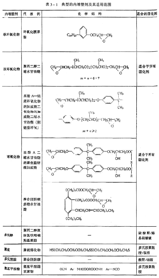 增塑劑多是短分子鏈的高沸點化合物。它通過物理作用使高聚物玻璃化溫度降低,達到改善加工性、賦予制品柔韌性的目的。單純的環氧樹脂固化物較脆,抗沖擊及抗彎性能差。為此,加入增塑劑,以便使固化物的脆性相應地減小,提高其柔韌性能。增塑劑也有內增塑劑和外增塑劑之分。增塑劑的主要作用是減少固化樹脂交聯點間鏈運動的勢壘。增塑劑的效能取決于它的結構。選用的增塑劑應和環氧樹脂體系有一定分子間的相互作用,否則增塑劑就有遷移和滲出的傾向。尤其在浸入液體和溶劑中后,增塑劑被抽出的現象將會更加明顯,所以外增塑劑一般是不被推薦的。表3-2是常用外增塑劑。 內增塑劑能與環氧樹脂體系形成一定的化學鍵,在環氧樹脂的交聯結構中引進一部分柔性較好的分子鏈段,從而降低環氧樹脂本體的模量,提高延伸率和沖擊韌度,但耐熱性能有所下降。內增塑作用可通過許多途徑來實現:①應用長鏈脂肪族胺類作為固化劑;②加入聚氨酯橡膠或羧基橡膠;③加入含羥基的長鏈有機化合物;④加入端羧基聚酯;⑤加入液體聚硫橡膠;⑥應用長鏈脂肪族環氧樹脂,包括環氧化油類,作主體樹脂。 典型的內增塑劑如表3-1所示。其中環氧類增塑劑不受固化劑種類的限制,而非環氧類增塑劑受固化劑種類的限制,因此表3-1中注明了其適用范圍。 內增塑劑與活性稀釋劑屬于同一個范疇,內增塑劑或多或少的顯示稀釋的效果,而活性稀釋劑或多或少地也顯示增塑的效果。如果硬要具體定義,可以這樣說,增塑作用大而稀釋效果小是反應型增塑劑,反之亦然。