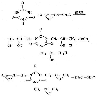 TGIC主體為三嗪核骨架含有3個環氧基,固化后比雙酚A型環氧樹脂交聯密度更緊密,因而具有優良的耐高溫性能,馬丁耐熱可達250℃,且有優良的耐候、光老化性,由于含氮量高達14%(質量分數)還具有優良的耐電弧性和自熄性。這些優良的性能使人們對它的合成和應用作了很多的研究。 典型的TGIC的物化性能如下: 外觀白色結晶粉末;分子量297.29;熔點102~105℃;黏度(120℃)0.058~0.065 Pa·s(Hoppler);環氧當量102~108g/mol(環氧值0.926~0.98m01/100g);有機氯<1.0%(質量分數);無機氯<0.3%(質量分數)。 TGIC的合成分二步第一步三聚氰酸和環氧氯丙烷在季銨鹽催化下發生開環加成反應: