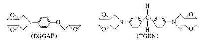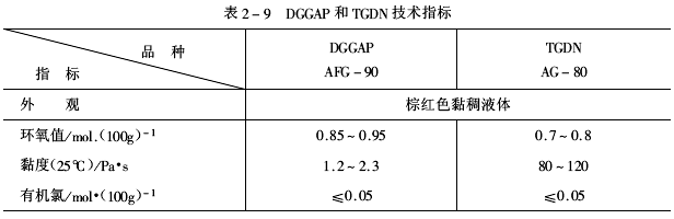 據資料報道,在帶有電動攪拌、溫度計、油水分離器的四口反應瓶中,投入12.9g三聚氰酸,140g環氧氯丙烷,0.5g四甲基氯化銨,7g水,不斷攪拌下,加熱至回流.將油水分離器上層的水分去,下層環氧氯丙烷返回到反應瓶中,在約40min時間內物料溫度緩慢由89℃上升至121℃,水脫完后將反應液冷卻至25℃。第二步分批加入含量97%(質量分數)的粉狀氫氧化鈉13.5g,約20min內加完,繼續反應半小時,其生成的氯化鈉固體加入50ml水使之溶解。把物料移至分液漏斗中除去水層。有機層用20ml 20%濃度(質量分數)的NaH2PO4水溶液中和,除去水層再用20ml水洗滌,再分去水層。有機層用無水氯化鈣干燥,過濾后,減壓蒸餾回收過量的環氧氯丙烷,即制得28.3g油脂狀的產品,收率為95%(質量分數)。再加入甲醇115g進行重結晶,溶液放在0℃下1晝夜,即得到18.7g白色結晶體收率為75%(質量分數),熔點103~104℃。 另據報道,反應器裝置和投料量同上,僅催化劑用量為0.24g分二次加入。第一步加成反應時先加入催化劑0.12g,第二步環化反應采用50%(質量分數)的NaOH28.8g和0.12g催化劑在60℃減壓下向物料中滴加,壓力控制在0.019~0.0199MPa,水和環氧氯丙烷共沸經油水分離器不斷地分去水分而環氧氯丙烷返回到反應液中,約80min完成水的分餾。然后逐漸將壓力降到0.012~0.013,這時再分出約25ml的水。這時放去真空并且冷卻,同上一方法一樣作后處理得到28.2g粗制品,用甲醇重結晶后得到22.9g白色的結晶產物,收率約75%(質量分數),經分析環氧值為0.964mol/100g,總氯含量1.1%(質量分數)。 TGIC最大的應用領域是和羰基為端基的飽和聚酯配合作為耐候、戶外用裝飾性粉末涂料之用。 (二)對氨基苯酚環氧樹脂和二氨基二苯甲烷環氧樹脂 DGGAP由美國聯碳公司率先開發的,牌號為ERLB-0500,國內產品牌號為AFG-90。TGDN瑞士CIBA-GEIGY公司牌號為Araldite MY 720,國內相似產品牌號為AG-80。兩者技術指標見表2-9。