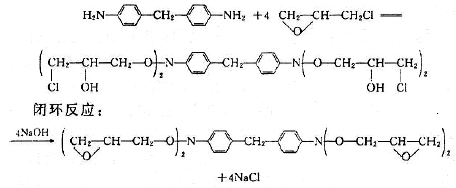 (1)合成 通常含有縮水甘油基樹脂的合成分兩步進行。首先氨基進攻環氧氯丙烷的環氧基生成氯代醇;然后在堿作用下(氫氧化鈉)發生閉環反應,生成縮水甘油胺和氯化鈉。此兩步反應常常同時發生,實際合成是使用過量的環氧氯丙烷,這樣既可作為溶劑,又可抑制低聚物的生成。環氧氯丙烷和多元胺反應是劇烈的放熱反應,必須在良好的攪拌狀態下,逐漸滴加環氧氯丙烷,并加強冷卻。以下以二氨基二苯甲烷為例表示主要反應式。 氯代醇的生成: