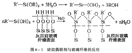 一、偶聯劑 1.作用機理偶聯劑因其分子結構中具有2種性能截然不同的基團,這2種基團分別和有機物、無機物結合,在界面間形成一種“橋梁”,使無機物、有機物二者能夠通過“橋梁”緊密的結合在一起而得名。偶聯劑的加入,使膠接面更耐介質、耐水、耐老化、綜合性能更佳。 以硅烷偶聯劑為例說明偶聯劑的反應機理。硅烷偶聯劑的分子結構中一般都帶有R′-Si-(OR)3的化學通式,R′代表親有機的基團,可以是乙烯基、甲基丙烯氧基、烷基氨基、烷基硫醇基、烷基環氧基等,Si(OR)3代表親無機的基團,其中(OR)3可以是烷氧基、乙酰氧基等,它們是可以水解的基團。R′基團能夠和環氧基團發生反應,(OR)基團可以和無機物如玻璃纖維、陶瓷、無機粉末填料相結合(化學的或物理的)如圖6-1所示。