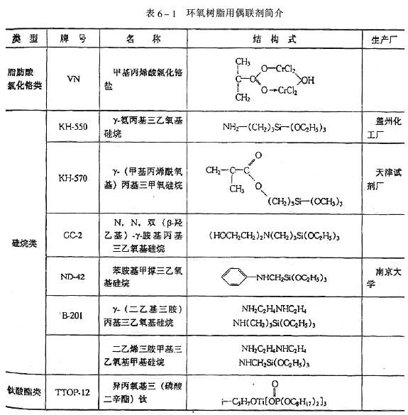 2.品種和性能 偶聯劑是新發展起來的一種新型復合材料用助劑。通常情況下,只需加入基料量(質量)的1%~3%就可使各種復合材料的物理、化學性能得到明顯的改進提高。所以,自20世紀70年代起,它就引起國內外的重視。 偶聯劑按其分子構成可分為:硅烷偶聯劑,可用于許多無機填料,其中在含硅酸成分多的玻璃纖維、石英粉及白碳黑中效果最好,在陶土和水合氧化鋁中次之,對不含游離水的碳酸鈣效果欠佳;鈦酸酯偶聯劑,與硅烷系偶聯劑相比,鈦酸酯偶聯劑具有價格便宜、使用范圍廣、多功能性等許多獨特的優點。鈦酸酯用量很少,卻能賦予涂料各種功能,以滿足各方面性能要求:它既是偶聯劑,又兼有分散劑、潤濕劑、粘結促進劑、固化催化劑、交聯劑、防銹劑和阻燃劑等多種功效;鋁酸酯偶聯劑和脂肪酸氯化鉻絡合物、含磷化合物等。 環氧樹脂用主要的偶聯劑見表6-1。