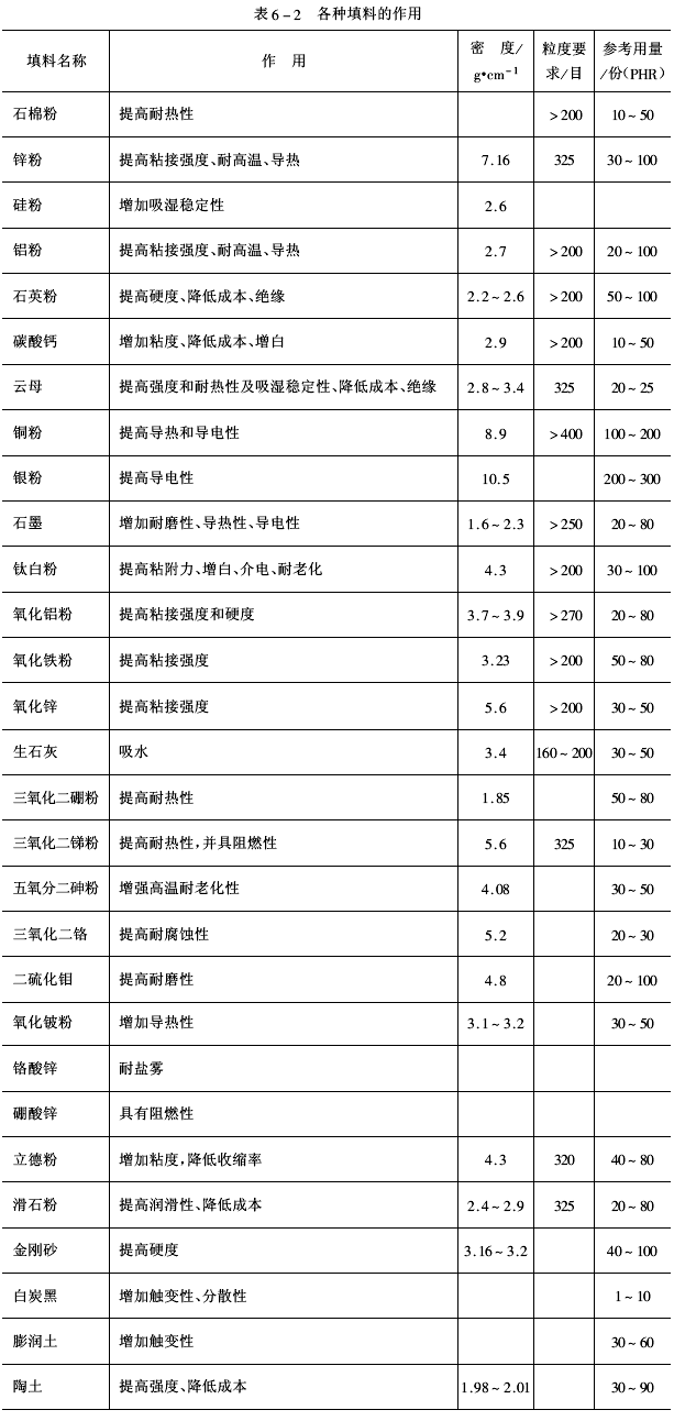 3.偶聯劑的選用原則 在選用偶聯劑時,主要由偶聯劑中所含的兩個性質不同的基團對被粘物表面及膠液本身的作用情況來決定。如X為氨基時,可以加入到環氧樹脂等膠粘劑,但不可用于聚酯膠。對于R基團也同樣要有選擇,如R為無反應性基團的烷基或芳基時,對環氧樹脂僅起物理作用。選用時還要注意價格與穩定性,以達到更好效果。 4.偶聯劑的使用方法 (1)偶聯劑可直接加入到膠液的配方里面,使之在混合均勻后,在施膠與固化中發揮其偶聯作用,此法又叫遷移法。 (2)填料表面處理法,即事先用配置成較稀的偶聯劑溶液,對填料進行表面化學處理,此時偶聯劑會在被處理的填料上進行親和取向,當其加入膠粘劑中后發揮偶聯作用。 兩種方法各有優缺點。效果也相差不大。可根據實際用途與條件加以選擇。 二、填充劑 1.加入填料的目的 填充劑也稱為填料。一般是指添加到環氧樹脂膠液中作為其中組分,以改變:環氧樹脂膠液的性能和降低成本的物料。 在環氧樹脂中使用填料的目的有以下幾個方面: (1)降低成本。 (2)抑制反應熱。 (3)延長樹脂混合物的適用期。 (4)降低樹脂固化物的收縮性。 (5)改善樹脂固化物的耐熱性。 (6)降低樹脂固化物的熱膨脹系數。 (7)降低樹脂固化物的吸水性,改善固化物的耐老化性及耐化學品性。 (8)提高樹脂固化物的抗壓強度,但抗拉強度及抗沖韌性會降低。 (9)改善樹脂固化物的耐電弧性及提高其它電性能。 (10)改善樹脂固化物的耐磨損性。 2.選用原則 使用填料時,必須根據使用要求加以選擇。應從以下方面加以考慮: (1)從化學角度來看,填料必須是中性或弱堿性的,不含結合水,對環氧基和固化劑為惰性,對液體或氣體的吸附性要很低。 (2)從操作應用角度看,填料粒度適宜,易于分散,應與樹脂等有良好的親和性,以保證粘接強度的改善,必要時要進行粒度搭配,在膠液中沉降性小。 (3)填料應經過干燥和清洗,不得有水、油污、雜質等,特殊的需要經過表面處理(如偶聯劑的處理)。 (4)填料應是無毒、不易分解、非易燃易炸的勻質固體物。 (5)來源容易,價格低廉。 3.填料用量及對粘接強度的影響 輕質填料因體積大,用量一般為10~25PHR;中質填料,如氧化鋁、氧化硅,一般在200PHR以下;重質填料,如鐵粉有時高達800PHR。填料用量范圍相當寬,須根據具體情況而定。 填料的加入,不僅由于在固化過程中降低了放熱峰、減少了收縮率、降低了熱應力,從而使膠接接頭(膠層)的缺陷減少,極大地保證了膠接接頭的質量,從而提高了粘接強度。而且還因為膠接接頭在載荷作用下,填料的存在有較好物理機械性能來承受,一旦處于超負荷作用時,出現了裂紋,加填料的膠層還能阻止裂紋擴展,而提高膠接接頭的壽命。如環氧樹脂膠用于金屬粘接,加適量鐵粉可提高剪切強度。此外填料加人還減少水分對膠接接頭的浸入而延長耐老化壽命。表6-2列舉了填料對固化物性能的影響。