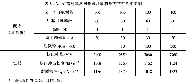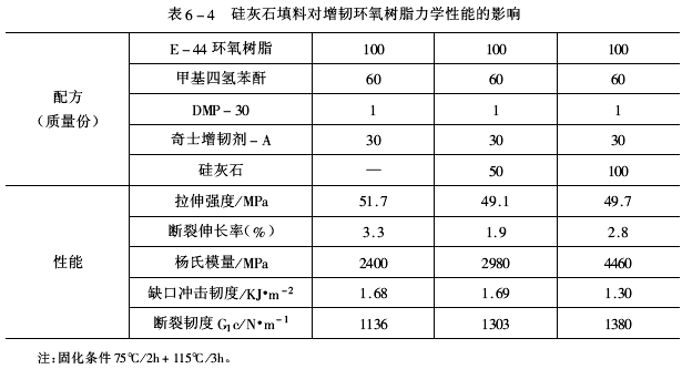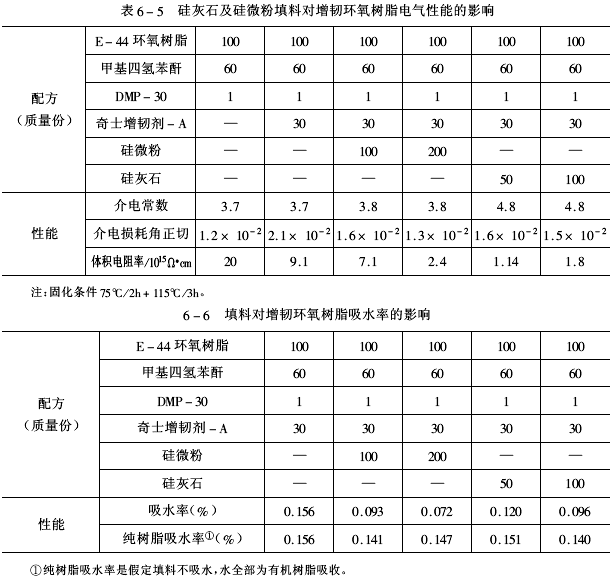 4.填料對環氧樹脂固化物性能的影響 在澆鑄、灌封材料的實際應用中往往加入大量的填料,而填料對增韌環氧樹脂體系的沖擊韌度、斷裂韌性等性能有什么影響,在拉伸狀態下填料界面的殘余應力處會有什么行為發生?都是人們十分關注的問題。 趙世琦、孫以實系統地研究了活性硅微粉、硅灰石等填料加入到含有自制的奇士增韌劑A、B、N增韌環氧樹脂體系中,對力學、介電性能的影響見表6-3~表6-5。表6-6為填料對提高環氧樹脂吸水率的影響。