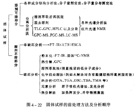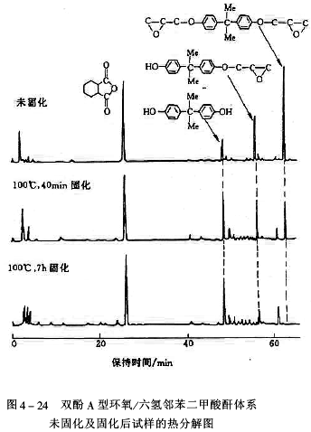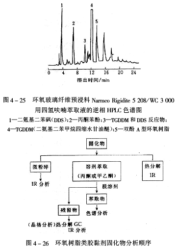 對于固化劑應注意的是胺類長期暴露在空氣中易吸收二氧化碳生成碳酸銨鹽;另外試樣在室溫下放置時間一長會進行固化反應,因此調制后的試樣必須盡快分析。在分析酸酐時可用GPC法。圖4-24表示了它的譜圖。 玻璃纖維預浸料的溶劑萃取物可用GPC檢出DDS固化劑,也可以用逆相HPLC來檢出DDS及雙氰雙胺。另外還可以同時檢出DDS、雙酚A型環氧樹脂、4,4′-二氨基二苯甲烷四縮水甘油醚,見圖4-25。 二、固化物試樣的剖析 固化物的前處理方法見圖4-22。即使是固化物總有一些微量的低分子成分殘留,用溶劑萃取后應用IR或NMR色譜分析是有效的。另外固化物表面呈平滑狀態用FT-IR(ATR方式)測定也是可以的。例如,用此方法對于涂在金屬板上環氧涂料的老化性的研究,先使用剃須刀刮下表面層的樹脂,然后用KBr粉末法進行紅外光譜分析是第一途徑。