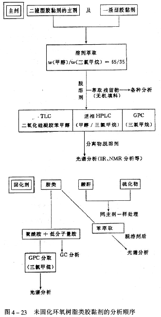 由于環氧樹脂通常也以組合物方式提供給客戶,它們由樹脂稀釋劑、固化劑、固化促進劑、其他助劑等多組分組成。采用某一種常規化學分析或某一種儀器分析都不能確定其成分。應該對試樣進行前處理再按照環氧樹脂的基本分析方法測定。以下是未固化樹脂組合物及固化后樹脂組合物的一般分離方法。 一、未固化樹脂組合物的剖析 未固化及固化的樹脂組合物試樣的前處理分離方法見圖4-22。未固化樹脂組合物中絕大多數成分是能在溶劑中溶解的,分離出不溶解部分多數為填料,溶液脫去溶劑后用色譜、光譜方法進行分析,必須注意溶劑的殘留會影響分析的準確性,因此最好使用三氯甲烷作為溶劑。圖4-23是未固化的環氧樹脂膠黏劑分析的順序。
