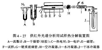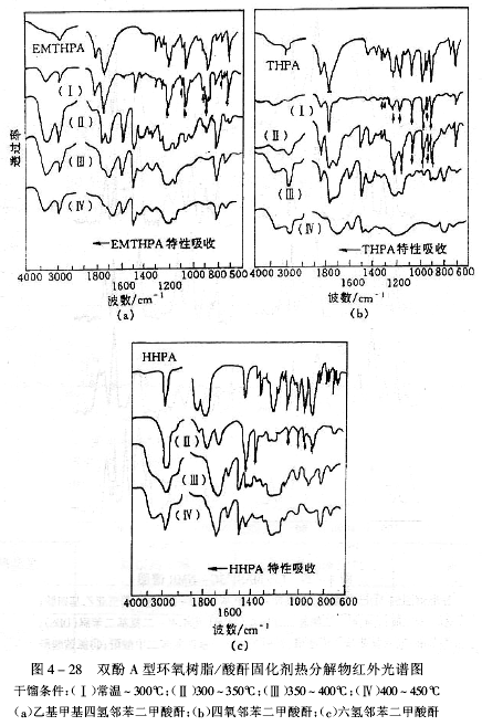 用元素分析(S、B、N、Cl等)法和圖4-22所列出方法一起使用能有效地分析出固化劑及固化促進劑。其分析順序見圖4-26。 采用干餾法熱分解試樣,收集升華物是鑒別酸酐類固化劑有效的方法。加熱裝置如圖4-27所示。產生的酸酐升華物附著在圖4-27試樣的正上面管壁上,取出后用IR法分析是有效的。 圖4-28表示了3種固化劑使用階段干餾物的IR光譜圖。利用這種方法從未知固化劑中分辨出苯酐、六氫鄰苯二甲酸酐,但是此法不能分辨出均苯四甲酸酐。