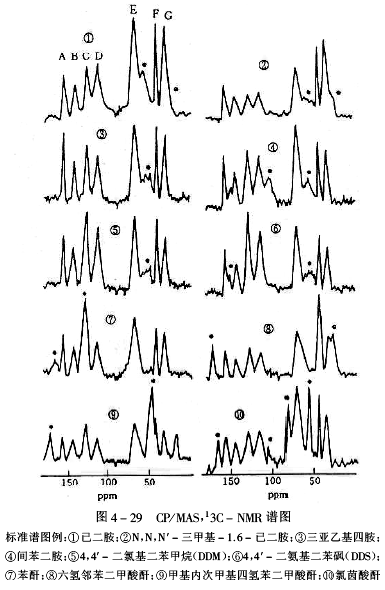 CP/MAS13C-NMR適用于固體狀環氧樹脂的分析。 ①由高功率的去耦切斷1H-13C間的雙極子相互作用。 ②由13C核長的緩和時間可防止由于交叉極化而引起的信號積算效率的下降。 用CP/MAS13C-NMR來測定雙酚A型環氧樹脂固化體系,能定性分析出10種以上固化劑,如圖4-29所示。有6種胺類固化劑及4種酸酐。 |