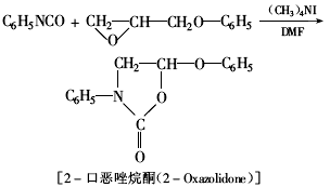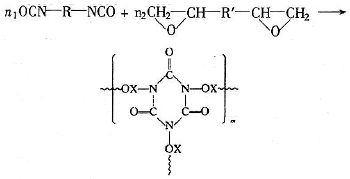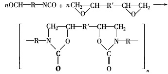 異氰酸酯三聚化反應(yīng)和異氰酸基與環(huán)氧基生成2-誕唑烷酮的反應(yīng)是同時發(fā)生并競爭的,所以通過適當?shù)暮铣煞椒?,可以得到一種分子中既有誕唑烷酮環(huán)又含有異氰脲酸酯環(huán)的交聯(lián)熱固性樹脂聚(異氰脲酸酯-誕唑烷酮)。聚合反應(yīng)可用下式表示: