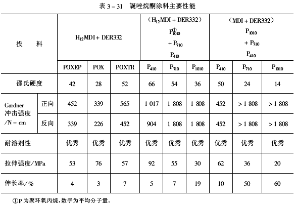 上式中“OX”表示含有誕唑烷酮環(huán)的鏈段。 由于結(jié)構(gòu)中含有大量的五元雜環(huán)、六元雜環(huán),使得PISOX材料具有優(yōu)異的耐熱性、耐介質(zhì)性、絕緣性、阻燃性和很好的機械強度;雜環(huán)之間如果有柔性鏈段存在又使材料具有較好的韌性。生產(chǎn)PISOX的主要原料是異氰酸酯和環(huán)氧樹脂,來源豐富,價格比較低廉,材料的合成和加工工藝也不很困難,使用也較方便。因此,PISOX是一種綜合性能優(yōu)秀,應(yīng)用前景廣闊的新材料,并已開始受到人們的重視。 趙寶宗,孫以實對PISOX的合成進行了研究,撰文論述了催化劑品種、投料比、合成路線等影響PISOX兩種成環(huán)的因素,綜述了以下應(yīng)用例。 二、PISOX的性能和應(yīng)用 PISOX樹脂經(jīng)得到實際應(yīng)用的領(lǐng)域有涂料、泡沫塑料、高溫澆鑄膠、絕緣涂層、黏合劑、復(fù)合材料等多方面。下面僅就它在涂料、泡沫塑和高溫澆鑄膠方面的應(yīng)用作一介紹。 (一)涂料 用POX材料做涂料,最早見于1972年的美國專利中。1983年Ford汽車公司的P.I.Kordomenos 等人研制出了誕唑烷酮涂料,其性能數(shù)據(jù)表3-30。其中,POXTR是I/E=2/1投料而得到的交聯(lián)產(chǎn)物。POXEP是I/E=1/2投料生成POX,再加酸酐固化的產(chǎn)物,也屬交聯(lián)聚合物,“POX”是I/E=1/1的非交聯(lián)產(chǎn)物。數(shù)據(jù)表明,兩種交聯(lián)產(chǎn)物都表現(xiàn)出高硬度、高拉伸強度和優(yōu)秀的耐溶劑性,但沖擊性能一般。為了改善其沖擊性能,他們在合成中加入端~OH基聚醚(即表3-31中的P410、P710、P1010),在結(jié)構(gòu)中引入柔性鏈段,從而大大提高了沖擊性。如表3-31。