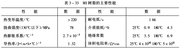 (三)耐溫澆鑄膠 1974年,日本日立公司用MDI與DER332反應(yīng)制得高溫耐熱PISOX材料,并進行了將PISOX用做大型轉(zhuǎn)動電機上使用的耐熱C級澆鑄膠的研究工作,從而開始了PISOX在電器澆鑄方面的應(yīng)用研究。此后,日立公司成功地將PISOX用于牽引電動機H級絕緣。1978年,日立公司又用PISOX 樹脂加49%的石英填料制成“MI”樹脂,應(yīng)用于干式大容量變壓器中做澆鑄膠。固化后“MI”樹脂的主要性能如表3-33。