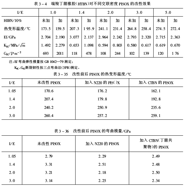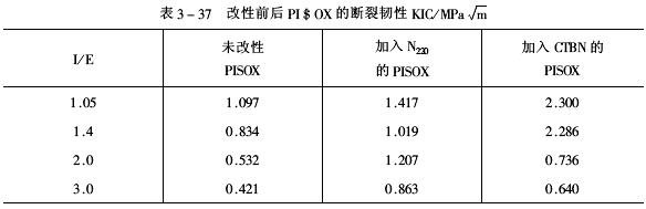 上述3個表列出的數(shù)據(jù)表明:無論是N220還是CTBN,它們的加入均顯著提高PISOX的韌性,并使PISOX的模量明顯下降,但在具體影響的程度上,HTBN、N220和CTBN間是有區(qū)別的。以N220為增韌劑時,熱變形溫度下降很少甚至個別有略微上升。 表3-34,表3-35,表3-36列出了在加有為樹脂總量10%的HTBN時對不同I/E(即液態(tài)二苯甲基-4,4′-二異氰酸酯/E-56環(huán)氧樹脂摩爾比)下所合成的PISOX的改性效果。顯然在相同的固化條件下,I/E的摩爾比越高,交聯(lián)密度越大,異腈脲酸酯六元環(huán)比越高產(chǎn)物的熱變形溫度也越高。從而可得出以下規(guī)律:(1)HTBN的加入能顯著提高PISOX的韌性,但材料的彈性模量有明顯降低,熱變形溫度有不同程度的下降;(2)PISX使PISOX的增韌幅度與PISOX的交聯(lián)密度有很大關(guān)系,一般來說,基體的交聯(lián)密度越小,其增韌幅度就更大。用CTBN、N220作增韌劑加入量均為7.5phr的效果,改性前后PISOX的斷裂韌性見表3-37。
