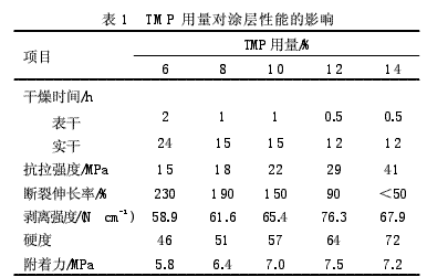 由表1結果可知,隨著TMP用量的增加,涂層體系中硬度含量提高,一方面束縛了柔性大分子的自由旋轉,另一方面由于分子間氫鍵作用加強,促進剛性鏈段的取向和有序排列,因此,提高了涂層的強度、耐磨性和表面硬度,但TMP用量太多,涂層脆性增加,斷裂伸長率下降,會影響到耐磨性和附著力。綜合考慮,多元醇用量確定為12%左右。 2.2氟樹脂對涂層性能的影響 由于氟原子(F)具有最高的電負性(4.0)、較小的原子半徑(0.135 nm),F—C鍵是所有化學鍵中鍵能最高的(485.6KJ/mol,高于紫外線的能量),氟碳涂層表面能低(23dyne/cm),摩擦系數極小(對鋼板滑動摩擦系數為0.15~0.17),因此,含氟碳結構的涂料具有超長的耐候性、耐磨性、優異的耐化學品性和自潔凈功能[4]。在成膜過程中,化學穩定的F—C鍵傾向于富集到涂層表面,起到了立體屏障作用,從而保護涂層免受紫外線、熱和其他介質的侵害,低表面能使其具有更好的抗沾污性能和疏水性能。但是,低表面能的氟樹脂通常與有機樹脂的相容性較差,為此,我們通過試驗,篩選了混容性相對較好、氟含量較高、黏度較低的瑞氟隆RF-101,通過用量試驗,制備出了EPU固化劑,將其與傳統六亞甲基二異氰酸酯(HDI)三聚體進行對比,結果見表2。