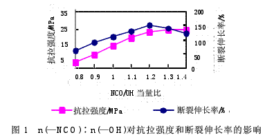 由表2對比結果可知,采用EPU固化劑的涂層在耐候性、力學性能、耐磨性、耐高低溫性以及對復合材料的附著力等方面均優于傳統HDI三聚體固化的涂層。在氟樹脂加量研究過程中發現,氟樹脂用量超過25%時,EPU固化劑與PE-6樹脂的混容性下降,清漆涂層出現發霧現象,對涂層干性、附著力和力學性能影響較大。 2.3 n(—NCO)∶n(—OH)對涂層力學性能的影響 雙組分聚氨酯涂料的制造技術之一是確定適當的n(—NCO)∶n(—OH),按理論計算,設定n(—NCO)∶n(—OH)=1,即使一個—NCO基團與一個—OH基團一一對應,完全反應,得到的涂層質量最好。但實際情況要根據試驗結果才能確定。圖1為不同n(—NCO)∶n(—OH)對彈性聚氨酯涂料抗拉強度和斷裂伸長率的影響。