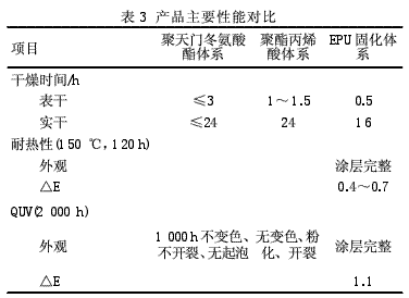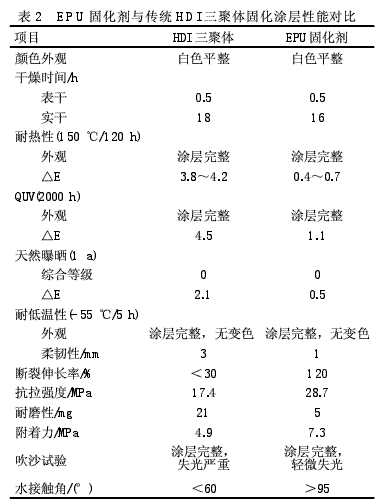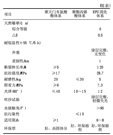 圖2結果可知,市售彈性固化劑水解穩定性較差,48 h耐沸水試驗后,涂層的抗拉強度和斷裂伸長率均下降為原來的30%左右,主要原因是水與樹脂中的酯基發生了化學降解反應,降解形成的羧酸又會進一步促進樹脂的水解;而EPU固化劑雖然也屬于聚酯型聚氨酯,但由于采用了低酸度的原料,又加入了化學穩定性極高、疏水性極好的氟樹脂進行改性,F—C鍵對酯鍵起到了屏蔽保護作用,因此,水解穩定性較好,抗拉強度和斷裂伸長率保持率均為90%左右。 3 ·EPU固化劑用于風電葉片保護涂料的可行性 風電是一種清潔型、可再生能源,加強風能的開發利用已經成為全球能源界的共識[5]。在經濟加速發展和環保要求越來越嚴格的大背景下,世界各國把開發風能作為可持續發展的重要舉措之一,有可能成為未來最重要的替代能源,受到廣泛關注,市場潛力巨大。隨著2006年我國《可再生能源法》的實施,國內風電呈現“井噴”式增長。 風力發電站主要由變速箱、發電機組、塔基和變電站等組成,其中風機葉片是發電機組中最關鍵的部件,造價占風力發電整個裝置成本的15%~20%。葉片材料根據葉片長度不同而選用不同的復合材料,目前普遍使用的是質量輕、機械性能好、成本較低的環氧玻璃鋼葉片,但其耐候性、抗磨損性差,我國風電場大都設立在西北、華北、東北以及東南部沿海、島嶼等地區,氣候條件惡劣,這就需要葉片涂料的涂裝保護。 根據葉片工作的特點和使用環境,葉片涂料除了要具有普通涂層好的附著力、裝飾性外,還要滿足超強的耐候性、超強的耐磨性、較好的彈性、優異的耐高低溫性、較低的表面能等要求。國內相關研究報道很少,與當前我國風能產業高速發展的態勢極不協調。EPU固化劑固化的涂層與國內資料報道的產品[6-7]主要性能對比見表3。