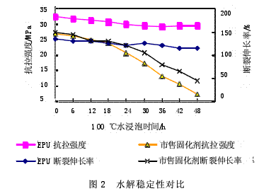 由圖1可知,如果n(—NCO)∶n(—OH)太小,—NCO基團不足以與—OH基團反應,漆膜的交聯密度較低,涂層發軟,抗拉強度和斷裂伸長率不理想;但是,如果物質的量之比太高,則多余的—NCO基團會吸收空氣中的潮氣轉化為脲,雖然可以增加交聯密度,提高涂層強度,但是也會使涂層彈性降低,脆性增加,抗沖擊性下降,涂層的表面狀態不好,出現針孔。經過試驗,確定該涂料體系的n(—NCO)∶n(—OH)以1.2為宜。 2.4涂層的水解穩定性 涂層的抗水解穩定性是加速檢驗涂層耐水性的重要方法之一,聚酯型彈性聚氨酯涂層由于體系中酯鍵的存在,其耐水性稍差,聚酯型與聚醚型彈性聚氨酯涂層相比,耐水性相差5~10倍[2],但是耐候性方面聚酯型的優勢明顯。研究中與某市售彈性聚酯型聚氨酯固化劑的水解穩定性進行了對比,結果見圖2。