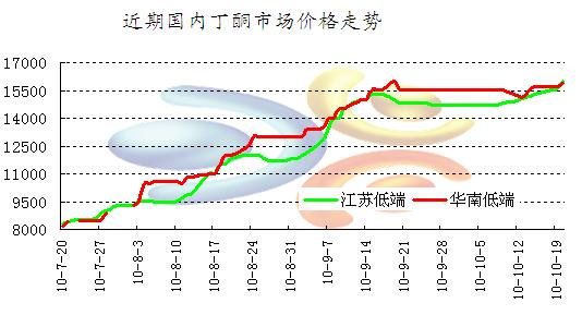 從下圖中我們可以看到,國內丁酮市場[ShiChang]從7月底開始上漲行情,盡管期間出現小幅的震蕩盤整,但截止目前[MuQian]仍為出現明顯下跌趨勢。市場[ShiChang]人士一直存在的恐高心態,大漲之后必大跌的局面一直未發生。而目前[MuQian]局部地區借助現貨難尋的利好支撐,重又獲得向上推漲的動力。早間華東地區持貨商報盤基本都在16000以上水平。那么丁酮市場[ShiChang]久居高位不下的原因是什么呢,筆者認為主要有以下幾點影響因素:
