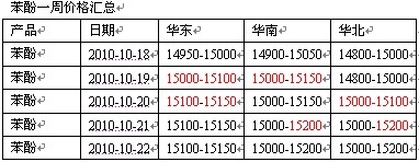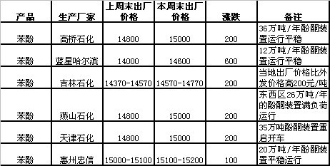 華北燕山周邊市場[ShiChang]穩定,價格[JiaGe]參考在15100-15150元;山東地區苯酚[BenFen]市場[ShiChang]商談[ShangTan]價在15350-15400元;福建地區苯酚[BenFen]市場[ShiChang]商談[ShangTan]清淡,經銷商出貨意向在15100-15200元/噸;廣東苯酚[BenFen]市場[ShiChang]交投安靜,貿易商出貨意向在15200元/噸左右;下游[XiaYou]工廠開工有限,整體[ZhengTi]詢盤一般,在成本壓力下采購謹慎。