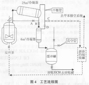 通過一定的改造,可以提高環氧氯丙烷的含量,而且可以達到90%以上。這樣除有益于產品質量外,還可以節約部分蒸汽,避免甲苯[JiaBen]循環蒸餾。據中國環氧樹脂[HuanYangShuZhi]行業協會(www.epoxy-e.cn)專家介紹,改造前閥門[FaMen]A是常開型,閥門[FaMen]B是常關型;只有在進行回收[HuiShou]ECH操作時,才開閥門[FaMen]B,關閥門[FaMen]A并送上真空;回收[HuiShou]操作完后,停蒸汽,關閥門[FaMen]B開閥門[FaMen]A使反應釜恢復常壓狀態。再往反應釜中加入甲苯[JiaBen]。此時部分甲苯[JiaBen]蒸汽就通過平衡管進入緩沖罐中。甲苯[JiaBen]溶解于ECH中,從而甲苯[JiaBen]就進入了回收[HuiShou]ECH系統,降低了回收[HuiShou]ECH濃度。改造前后的工藝流程參見圖4。