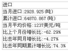 據(jù)海關(guān)統(tǒng)計(jì)當(dāng)月金額在362.31萬美元,累計(jì)總金額在8576.72萬美元,.當(dāng)月進(jìn)口均價(jià)為1237美元/噸.累計(jì)均價(jià)為1322.12美元/噸.據(jù)海關(guān)統(tǒng)計(jì).當(dāng)月金額在14.62萬美元.累計(jì)總金額在367.4萬美元.當(dāng)月出口均.....