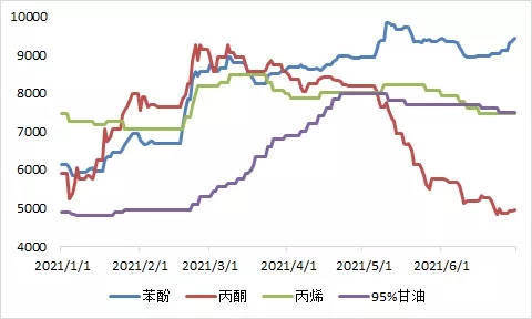 苯酚:持續(xù)上漲,從年初的6100元/噸直升至6月底的9500元/噸,上半年漲幅55.7%;